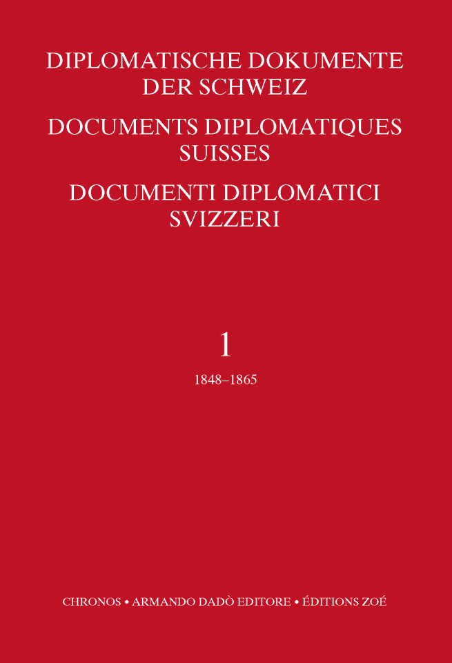 Aktenedition DDS, Bd. 1 (1848–1865) ISBN 3-7165-0704-0 Diplomatische Dokumente der SchweizBand 1 (1848–1865)bearbeitet von Prof. J.-Ch. Biaudet,Université de Lausannegebunden, mit Schutzumschlag, 16x24cm,1990. XCIV und 1'109 Seiten.CHF 150.– pdf Dokumente in Dodis Dokumente in Dodis ISBN 3-7165-0704-0