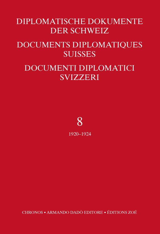 Aktenedition DDS, Bd. 8 (1920–1924) ISBN 3-7165-0609-5 Diplomatische Dokumente der SchweizBand 8 (1920–1924)bearbeitet vom Büro der Kommissiongebunden, mit Schutzumschlag, 16x24cm,1988. XCVI und 1'042 Seiten.CHF 150.– pdf Dokumente in Dodis Dokumente in Dodis ISBN 3-7165-0609-5