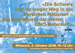 Dr. Marianne von Grünigen, alt Botschafterin und ehemalige Chefin der Ständigen Vertretung der Schweiz bei der OSZE und bei der UNO in Wien referierte am 2. Oktober 2019 zum Thema «Die Schweiz und ihr langer Weg in die UNO - Die Entstehung der ersten UNO-Botschaft von 1981». Der Vortrag fand im Rahmen des Kurses «Die Neutralisierung des schweizerischen Multilateralismus? Die Beziehungen der Schweiz zur UNO 1942-2002» am Historischen Institut der Universität Bern statt.